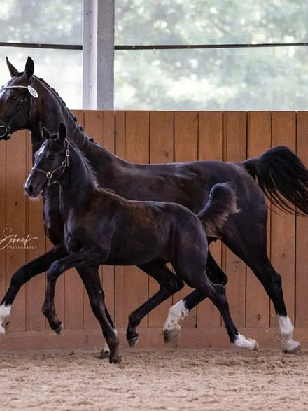 Description: A top prospect for sport, could also become a strong stallion prospect. 3 great gaits, correct conformation, both parents have been trained to or competed Grand Prix. Should finish around 16.2/3hh.